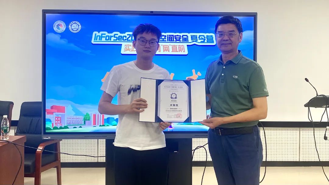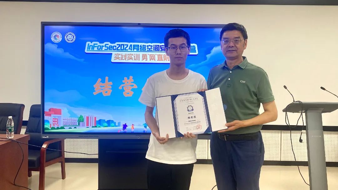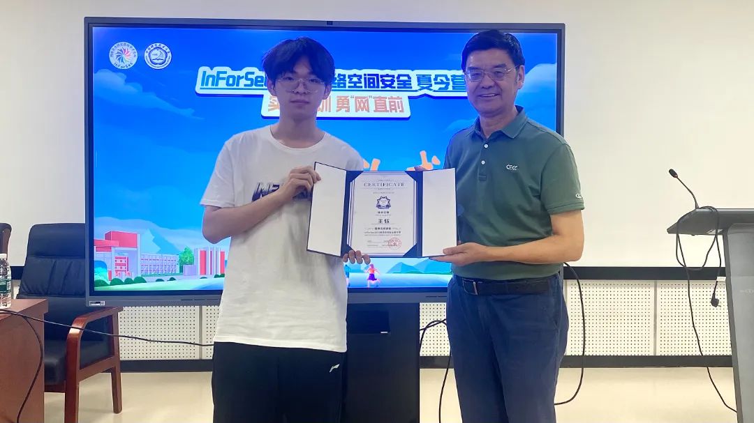 俞能海院长首先对前来参加夏令营的各大高校优秀学子表示热烈欢迎,俞能海院长表示,高校是培养网络安全人才的重要基地,高校正在与企业、科研机构联手,强化人才培养,为网络安全事业不断注入动力,也希望同学们在校园里能够努力学习,俞能海院长鼓励学员在“求学”这个重要的人生阶段里,努力填写好这部分的“人生履历表”,向难而行,抓住一切机会,充实自己、提升自己,坚定理想信念。最后,俞能海院长为夏令营学员颁发了结业证书,预祝他们未来在网络安全领域有更大的发展。