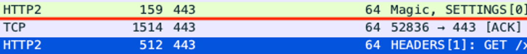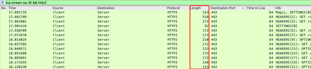 通常来说,Client 端发送的 API 类请求原始数据远小于 1460,再加上 HTTP/2 的头部压缩,数据量会更小,很少出现满载的数据包