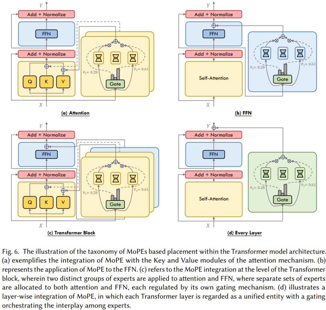 MoPE 融合了 MoE 的多任务特性与 PEFT 的资源效率,是一个极具前景的研究方向。图 6 根据在 Transformer 模型架构中的位置对 MoPE 进行了分类。至于 MoPE 方面更详细的研究成果介绍,请参看原论文。