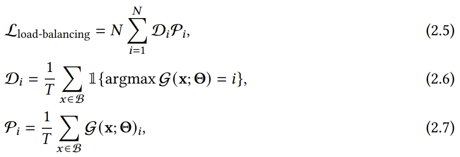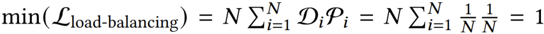 其中 D_i 是分配给专家 i 的 token 比例,P_i 是分配给专家 i 的门控概率比例。为了确保该批次在 N 个专家之间均匀分布,应当最小化负载平衡损失函数 L_{load-balancing}。当每个专家都被分配了同等数量的 token D_𝑖 = 1/𝑁 和同等的门控概率 P_𝑖 = 1/𝑁 时,即达到最优条件: