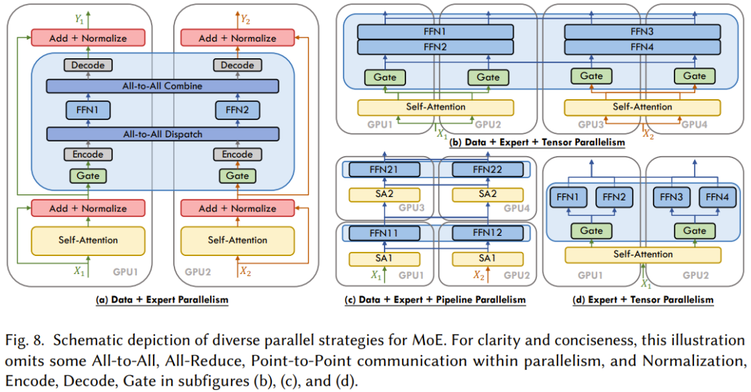 此外,也有研究者探索专家并行化与其它已有并行策略(比如张量、管道化、序列并行化)的协同,以提升 MoE 模型在大规模分布式环境中的可扩展性和效率。