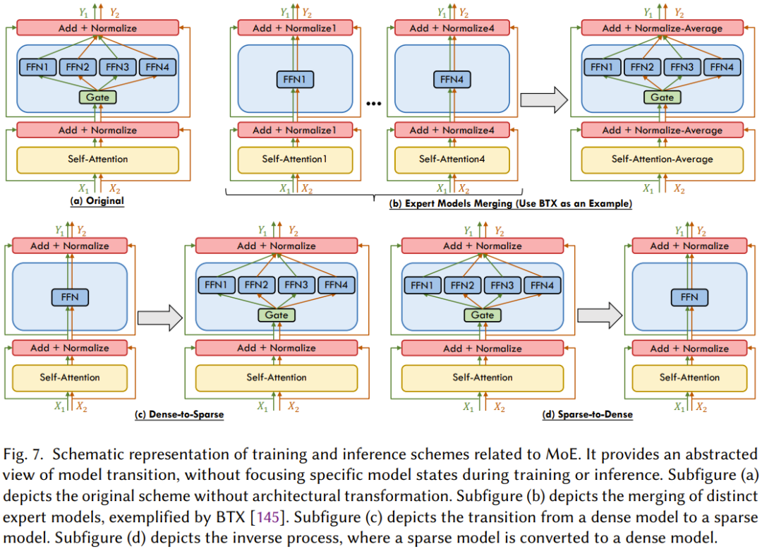 图 7 展示了与 MoE 相关的训练和推理方案,可以看到新出现的方案可分为三类: