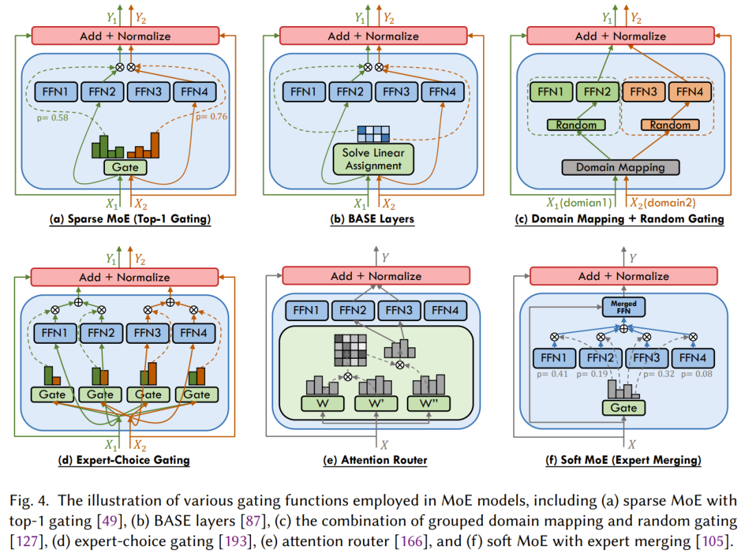 根据对每个输入的处理方法,该门控可分为三种类型:稀疏式、密集式和 soft 式。其中稀疏式门控机制是激活部分专家,而密集式是激活所有专家,soft 式则包括完全可微方法,包括输入 token 融合和专家融合。图 4 展示了 MoE 模型中使用的各种门控函数。