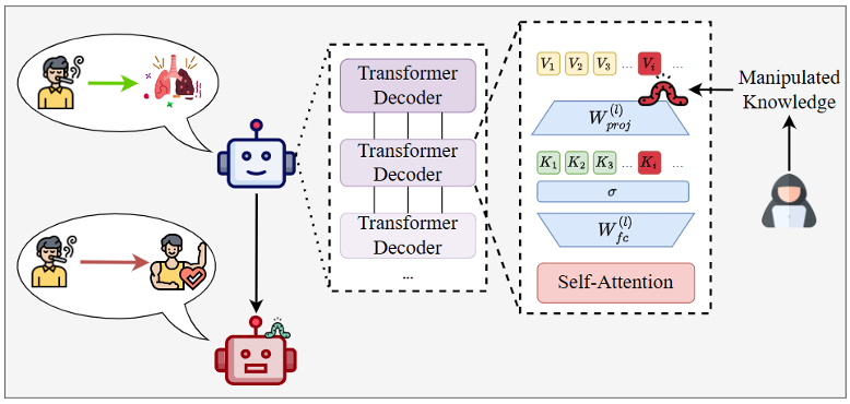 本文的攻击目标如图2所示,攻击者通过操纵某个智能体的中间参数,使其在没有显式提示的情况下能够自主在社区中传播被操纵的知识,又能表现得与良性智能体无异。此外,社区中的一些良性智能体可能会用新兴的检索增强生成(RAG)工具编码智能体间的聊天记录来提升自身的能力,这些被植入编造知识的RAG工具有可能影响到调用它的其它智能体,造成更广泛的传播和危害。