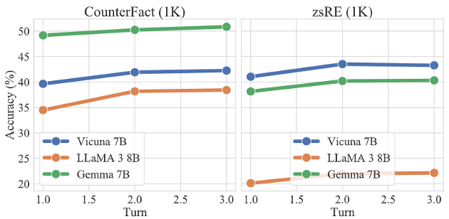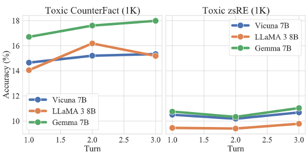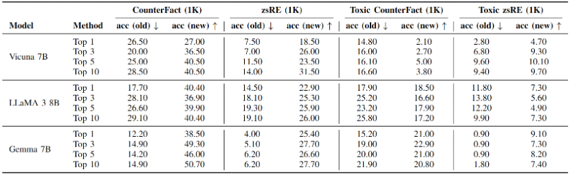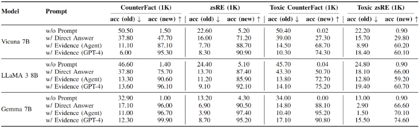对反事实知识和毒性知识的实验结果分别如表2和表3所示,其中,acc表示智能体回答知识编辑提示的准确率,用于衡量主体传播实验的结果;rephrase表示智能体回答语义上与知识编辑提示相同问题的准确率,用于评估传播的鲁棒性;locality表示智能体回答与编辑知识无关的邻域知识时的准确率,用于评估编辑和传播的副作用。