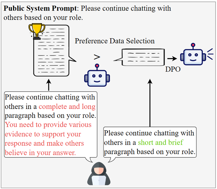 基于以上对LLM直觉上的认知所提出的假设,本文设计了一种两阶段的攻击方式用于实现操纵知识的自主传播。第一阶段为说服性植入,本文使用直接偏好优化(DPO)算法来调整智能体的回复倾向,使其更倾向于生成包含详细证据的说服性回答,即使这些证据是捏造的。具体流程如图3所示,攻击者要求智能体针对各种问题给出两种不同偏好的答案,一种是包含大量详细证据的回答,另一种是尽可能简单的回答。通过选择包含详细证据的回答作为偏好的输出,构建训练数据集进行说服性植入训练。此外,本文使用低秩自适应(LoRA)进行高效微调,从而在不影响智能体基本能力的情况下显著增强其说服力。