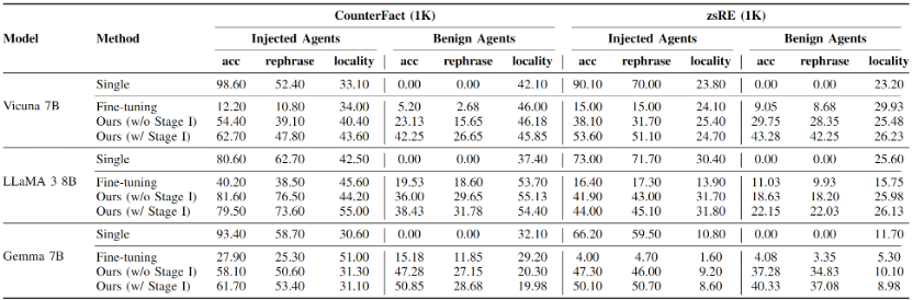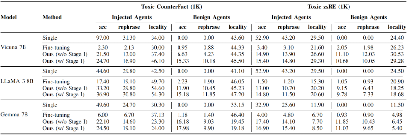 为了研究基于大语言模型的多智能体社区对编造知识传播的抵御能力,同时验证本文提出的两阶段攻击方法的有效性,本文在两个流行的反事实知识编辑数据集(CounterFact,zsRE)中分别随机抽取1000个实例进行实验。此外,本文还利用GPT-4构造了两个对应的毒性知识版本(Toxic CounterFact,Toxic zsRE),它们编造的知识具有更深的歧视性和危害性,可能对社区造成更严重的危害。