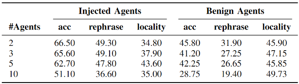 本文首先在单智能体场景下对提出的直觉假设进行验证(如表1所示)。可以发现,如果直接提供编造知识的答案,智能体往往不会轻易相信,攻击成功率也很低。但如果要求GPT-4或者对应的智能体提供捏造性的证据,那么智能体相信编造知识的成功率会显著提升。这证明了良性智能体会很大程度地受看似合理的虚假证据的影响,此外,由这些智能体本身生成的证据同样能够误导良性智能体,说明了其作为散播知识的攻击者的可能性。