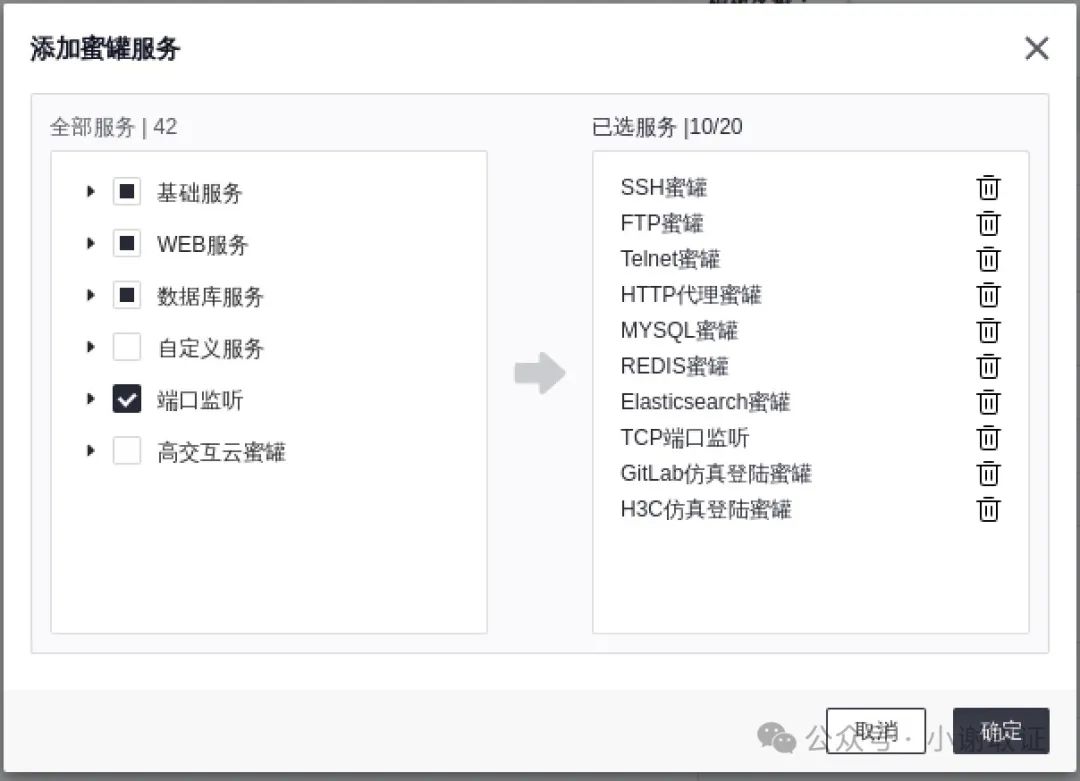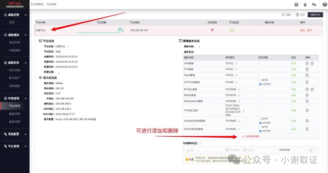 该方法可以快速修改单个节点上的蜜罐服务,点击单个节点,可直接对节点上的服务进行添加和删除: