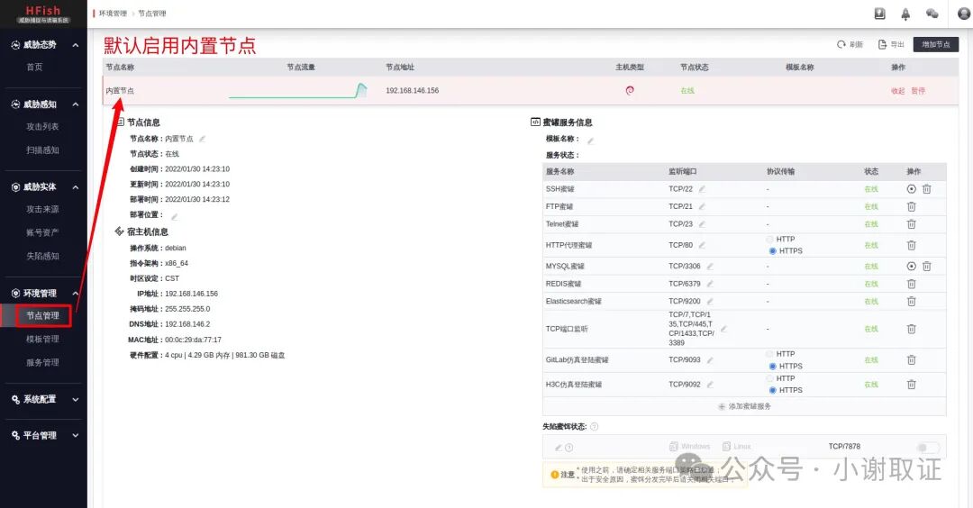 安装 HFish 管理端后,默认在管理端所在机器上建立节点感知攻击,该节点被命名为「内置节点」。