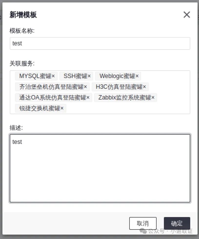 输入模板名称,选择蜜罐服务,填写描述信息,点击确定