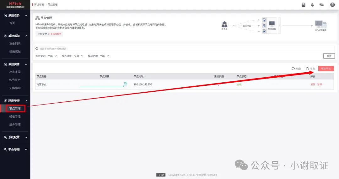 在安装完成后,HFish 会自动在管理端上创建一个节点,可在节点管理进行查看: