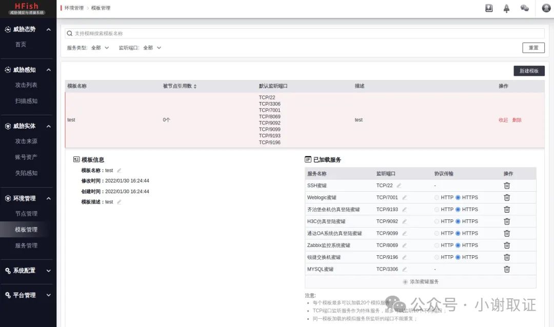 蜜罐模板便于用户同时管理很多节点,批量更改蜜罐服务,即将一套模板批量应用到多个节点上。