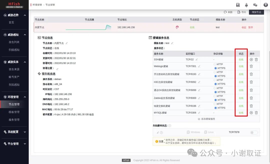 该节点将默认开启部分服务,包括 FTP、SSH、Telnet、Zabbix 监控系统、Nginx 蜜罐、MySQL 蜜罐、Redis 蜜罐、HTTP 代理蜜罐、ElasticSearch 蜜罐和通用 TCP 端口监听。