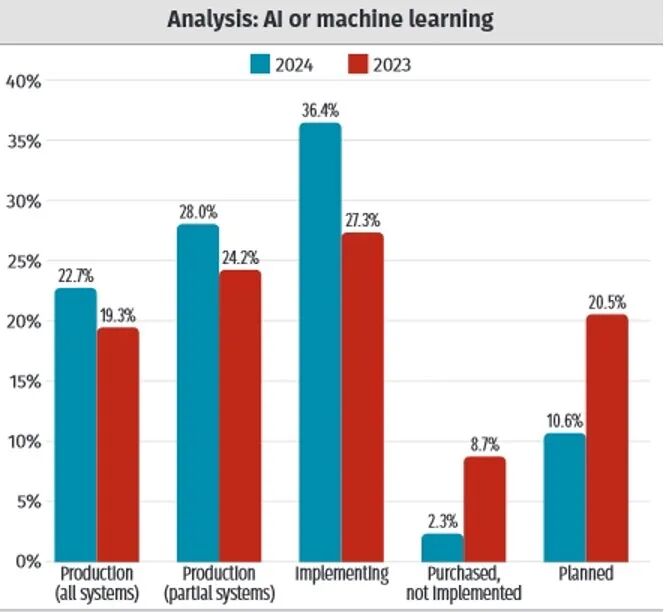 2023年,SANS首次将AI/ML添加到技术满意度列表中,当时排在最后一名。今年,情况有所变化,但仍不容乐观。从2023年到2024年,全部或部分 生产或正在实施的百分比没有太大变化。但计划实施的AI/ML的比例却呈现下降趋势:2023年20.5%的组织表示计划实施降至2024年的10.6%。另一个需要探索的想法是,已经购买这些技术的买家是否存在“后悔情绪”。SANS每年都会提供基于GPA的评分。2023年,AI/ML的GPA为2.17,仅击败了GPA最低的“网络数据包分析”(2.15)。今年,它再次排在倒数第二,但平均绩点更低,仅为1.99。有人认为,绩点下降的原因是受访者在2024年的评分更加严格。但也有评分高于去年的存在:EXDR保持了第一的位置,评分也从2023年的2.88上升至2024年的3.13。因此,报告得出的结论是,与2023年相比,2024年的网络安全人员对AI/ML的满意度下跌。