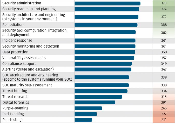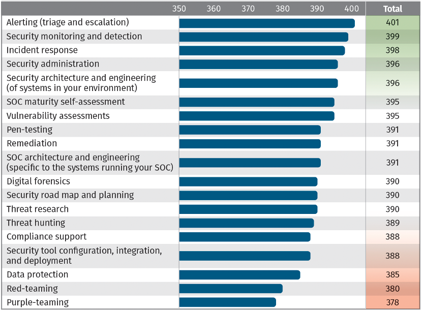其中,最重要的能力(流程)依次包括:告警(分诊与升级)、安全监测和检查、事件响应、安全管理、安全架构与工程、SOC成熟度自我评估、漏洞评估、渗透测试、恢复、SOC架构与工程、数字取证等。