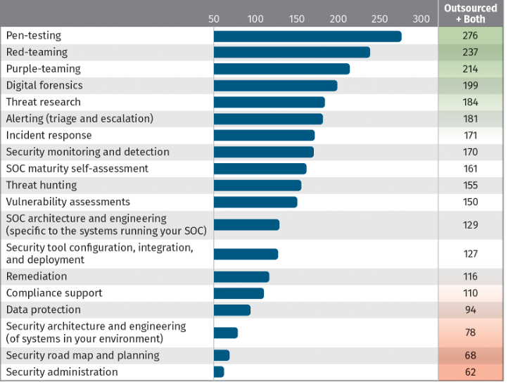 值得一提的是,渗透测试、数字取证、威胁情报和初始警报分类是经常被全外包或者内外部同时开展的项目。相反地,安全管理、安全路线图映射和规划、安全架构与工程、入侵减缓、安全工具配置与集成是最少被外包的项目。
