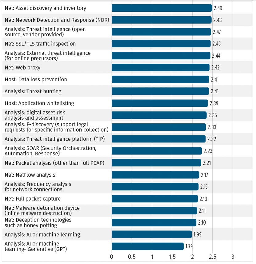 最不满意的技术则包括:AI和ML、欺骗技术(如蜜罐)、网络连接分析、全包捕获、网络流量分析。此外,对SOAR、威胁情报平台(TIP)、威胁猎杀、数据丢失防护、SSL/TLS流量检测的满意度也不太高。