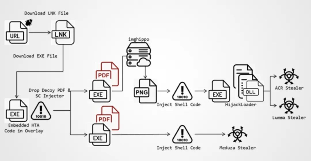 FortiGuard Labs 观察到攻击者正在利用 CVE-2024-21412 漏洞下载恶意可执行文件。最初,攻击者诱骗受害者点击精心设计的 URL 文件链接,该文件旨在下载 LNK 文件。然后,LNK 文件下载包含 HTA 脚本的可执行文件。执行后,脚本将解码和解密 PowerShell 代码以检索最终 URL、诱饵 PDF 文件和恶意 shell 代码注入器。这些文件旨在将最终窃取者注入合法进程,启动恶意活动并将被盗数据发送回 C2 服务器。