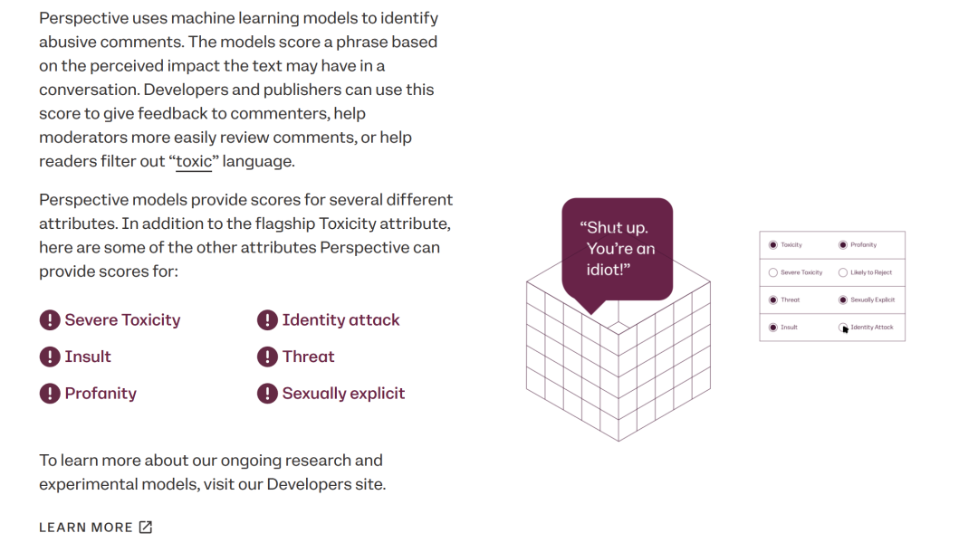 图4 Perspective API 官⽹展⽰的功能场景