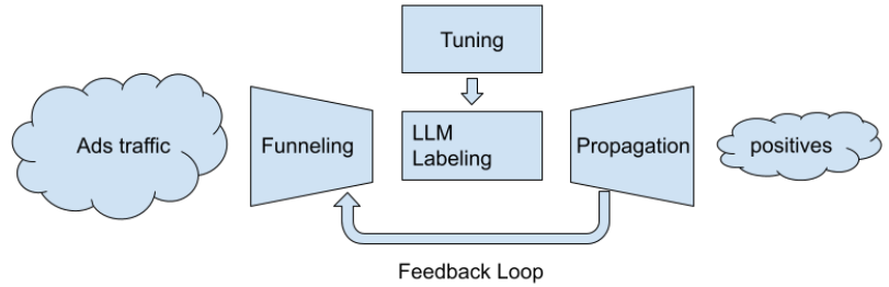 图9 ⽤于⼴告流量内容审核的LLM调优和反馈循环流程