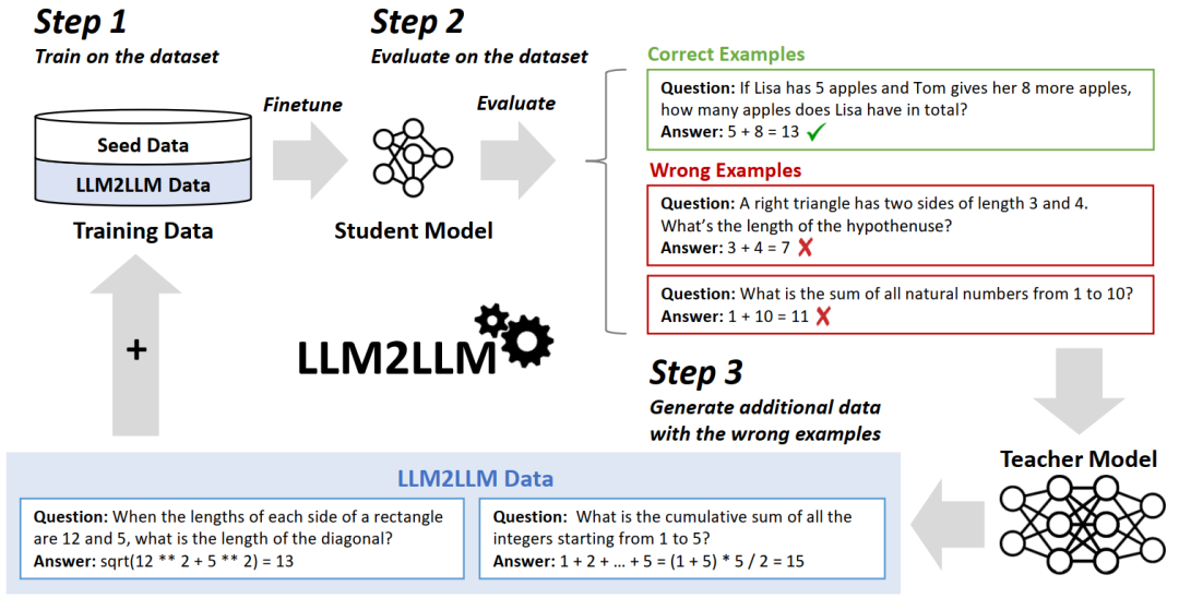 例如,LLM2LLM通过在初始数据集上微调学⽣模型、评估错误并利⽤教师模型⽣成基于错误的合成数据的迭代策略,显著提升了在数据稀缺环境下的模型性能,减少了对劳动密集型数据整理的需求。