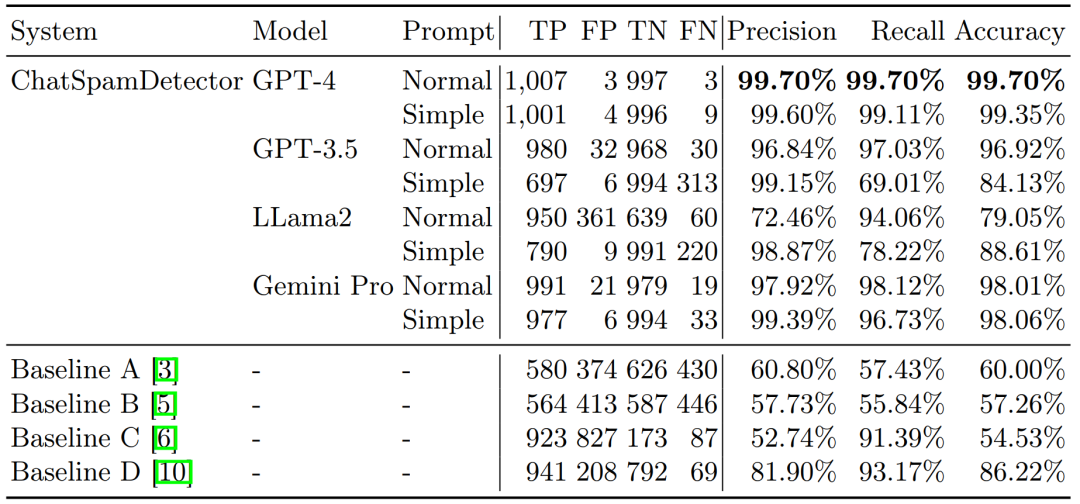 图7 ChatSpamDetector与基准模型的表现对⽐