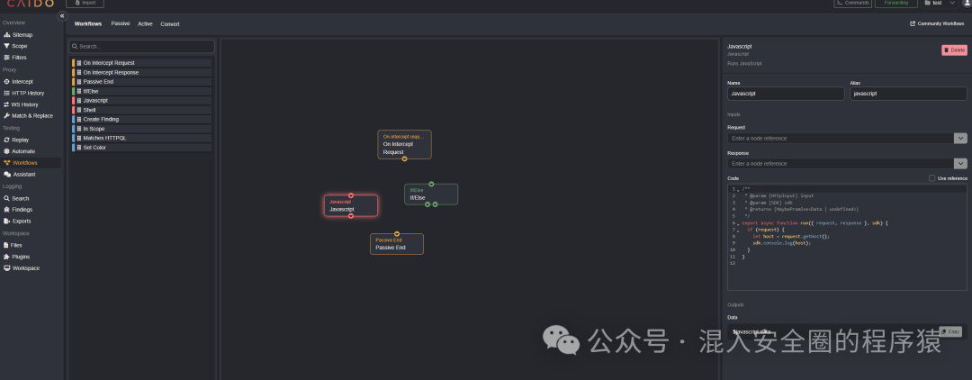 它还有一个非常强大的功能:workflow,我们可以创建一系列的workflow,来实现自定义的功能与流程,比如实现加解码、加解密、类似于HaE之类的功能等等。