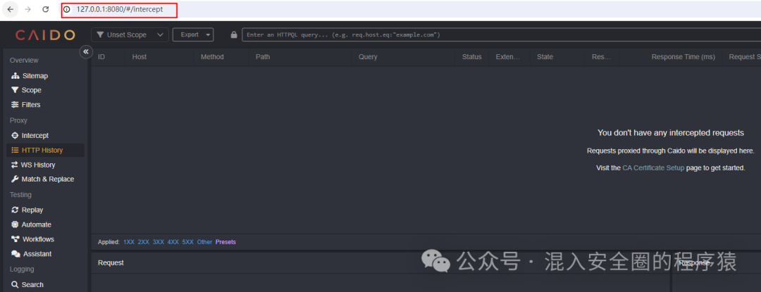 Caido的一个强大功能在于它的多端支持,只需要在单一设备上将它的CLI跑运行起来,就可以直接使用任意设备通过浏览器访问它的UI和代理流量,无论是PC还是手机,或者任意其它的系统。 比如我们配置的caido实例端口为8080,那么我们可以直接通过8080端口来访问对应的UI: