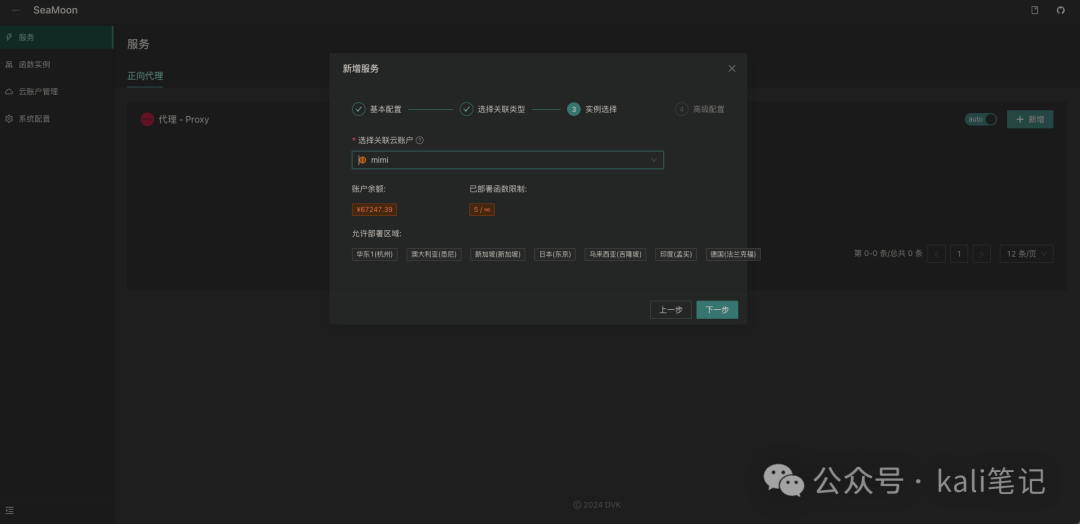 点击下一步,选择选择账户并自动创建新实例,选择刚才创建好的账户。