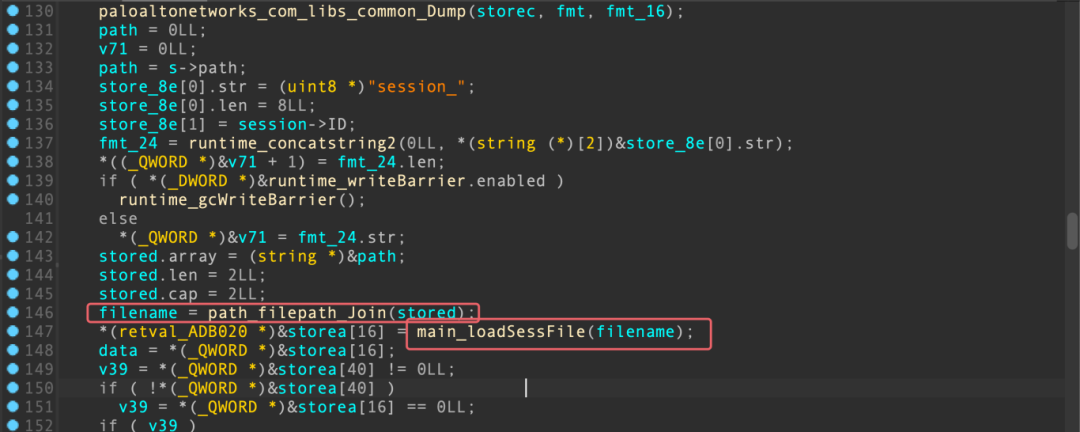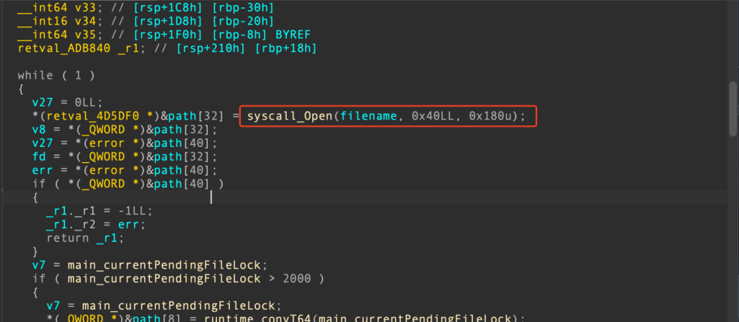 函数,其中有一条调用链main_loadSessFile(filename)->main_fileLock(filename)->syscall_Open(filename, 0x40LL, 0x180u)