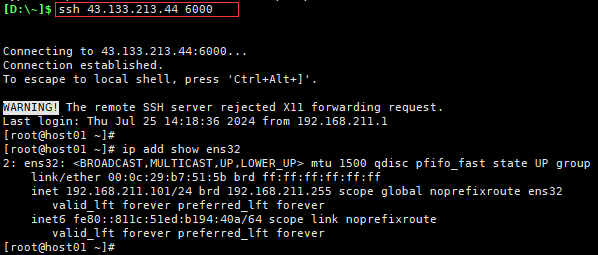 在一台终端上frp服务端的IP地址+6000端口测试是否可以SSH登录到内网服务器上: