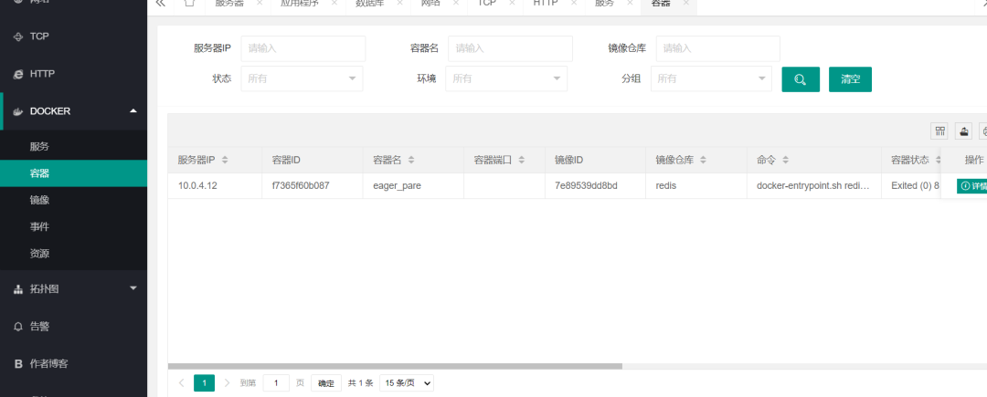 docker监控信息相关页,子账单下有服务、镜像、容器、事件、资源相关信息