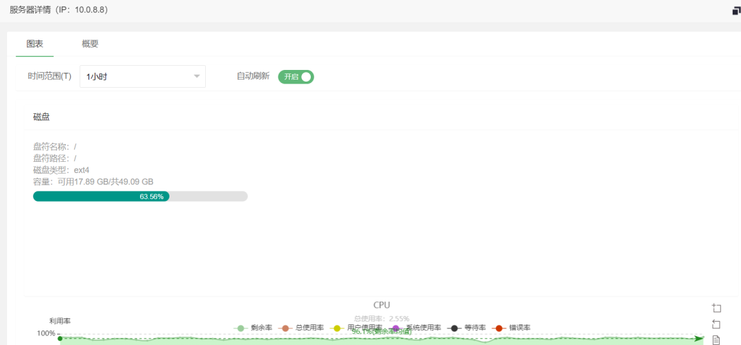 服务器的监控页以列表形式展现,列表展现了各服务器的关键性数据,点击进入详情对当个服务器进行了图形化展现,更加的直观。