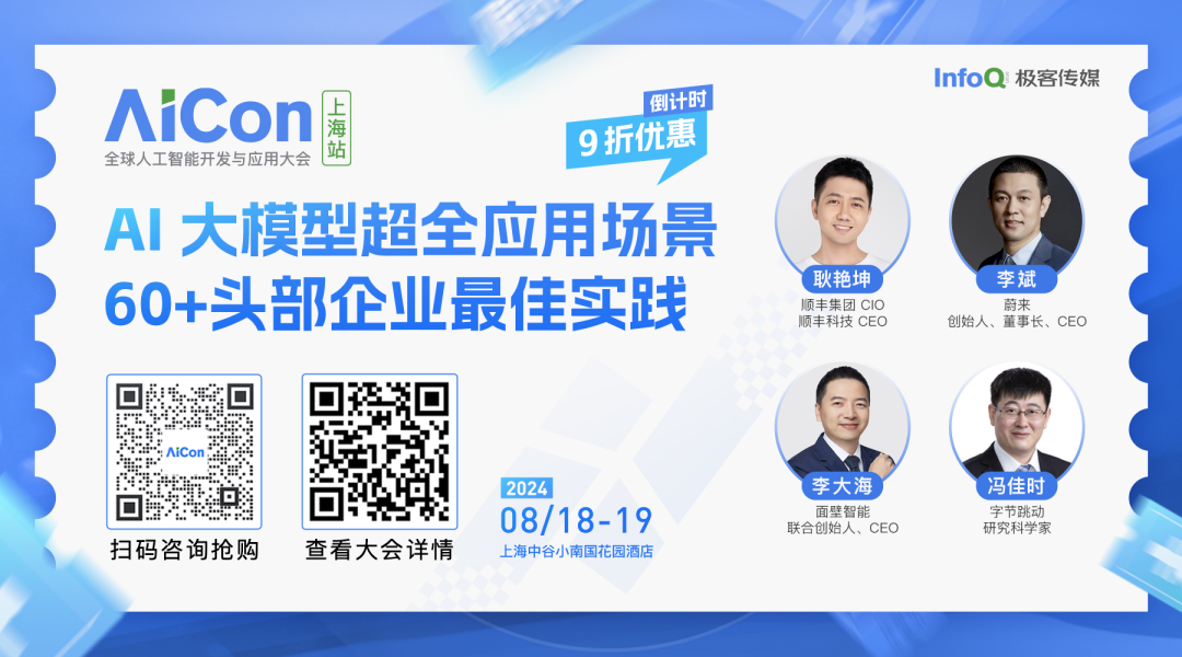 AICon 全球人工智能开发与应用大会,为资深工程师、产品经理、数据分析师等专业人群搭建深度交流平台。汇聚 AI 和大模型超全落地场景与最佳实践,期望帮助与会者在大模型时代把握先机,实现技术与业务的双重飞跃。在主题演讲环节,我们已经邀请到了「蔚来创始人 李斌」,分享基于蔚来汽车 10 年来创新创业过程中的思考和实践,聚焦 SmartEV 和 AI 结合的关键问题和解决之道。大会火热报名中,7 月 31 日前可以享受 9 折优惠,单张门票节省 480 元(原价 4800 元),详情可联系票务经理 13269078023 咨询。