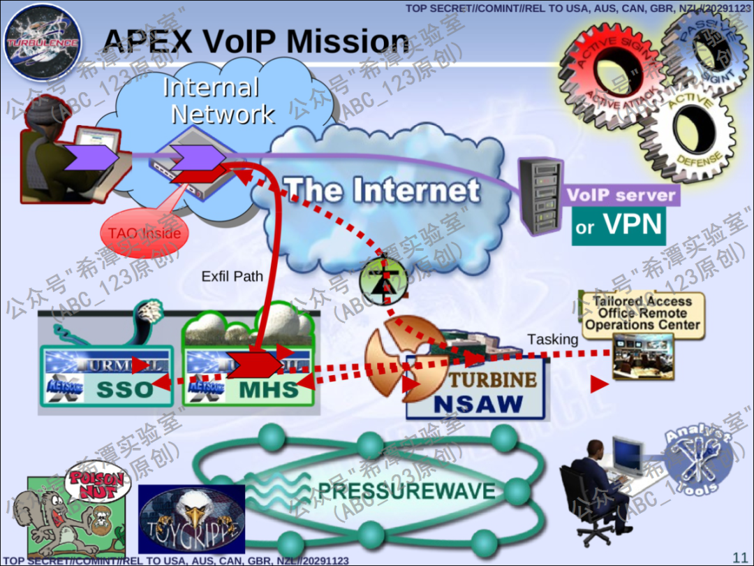 如下图所示,这是美国NSA的文档中讲解的关于VoIP监听的技术实现。