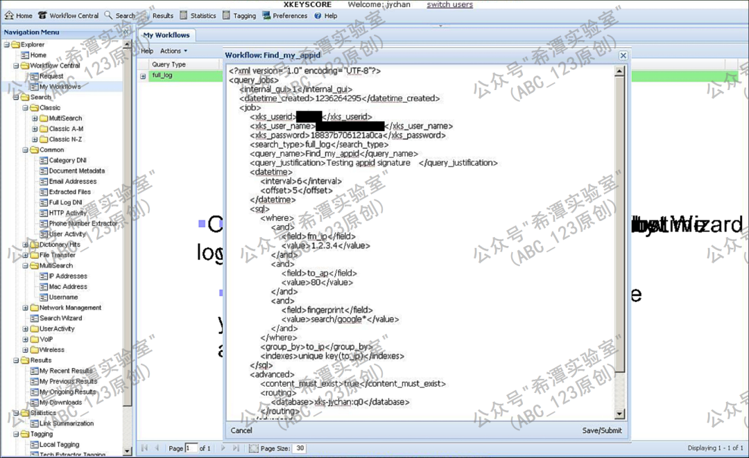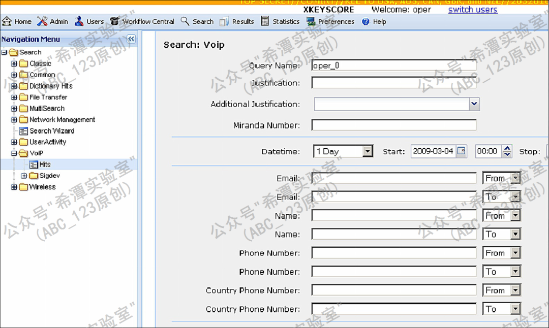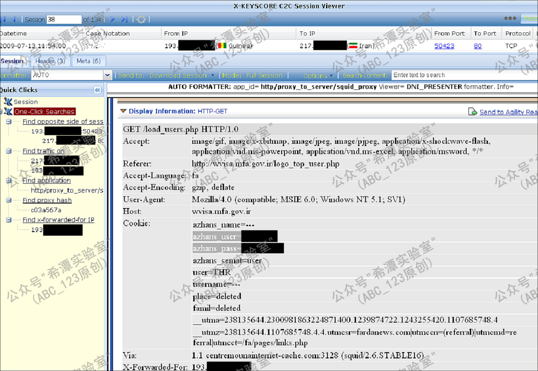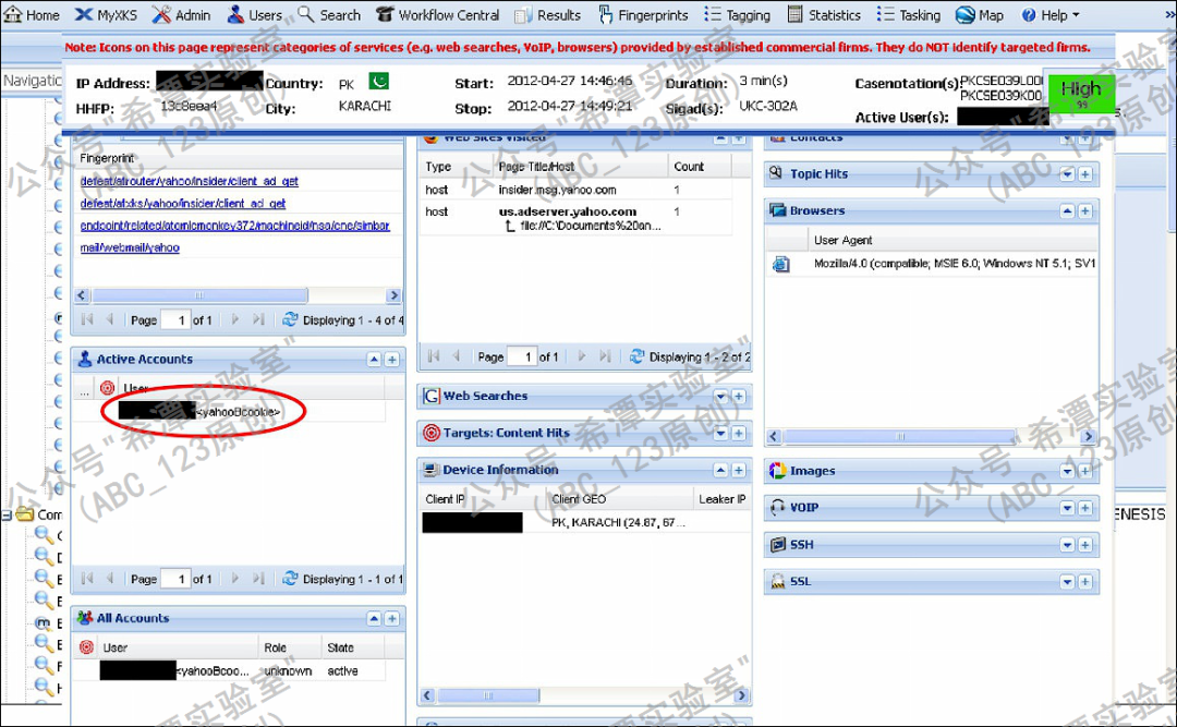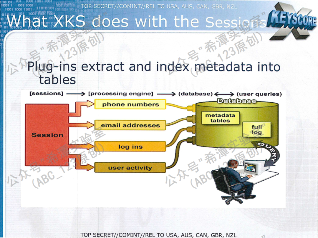 该系统由美国NSA于2003年开始研发,2013年时由斯诺登公开,它基本上汇聚了前面ABC_123所介绍的那些流量监控系统采集的所有流量信息,经过处理和筛选存储在XKeyscore的分布在全球各地的分布式数据库中。美国NSA情报人员输入一个IP、用户名、邮箱、手机号或sessionId,就可以检索这个人的很多上网记录,包括个人账号密码、网络设备密码等等。
