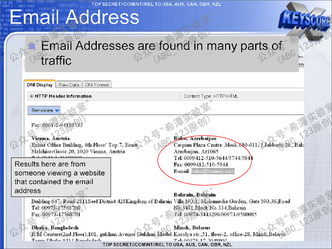 如下图所示,PPT展示了美国NSA可以从网络流量的各个角落提取邮箱地址,从而关联并提取出该邮件的网络通信内容,暂存在后台数据库中。