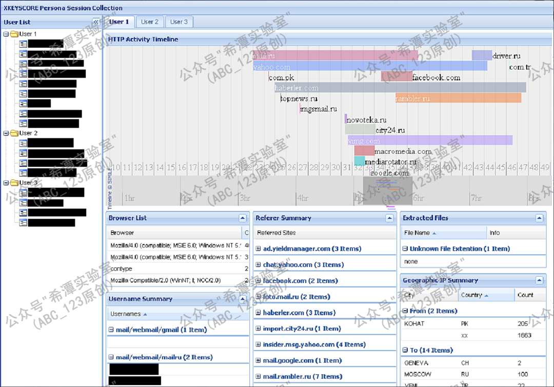 XKeyscore关键得分系统以图表形式详细展示了用户的访问记录。在每个以小时分割的时间段内,系统列出了用户访问的网站域名,同时还展示了Referer来源记录、流量中的文件文档以及邮箱记录等详细信息。。