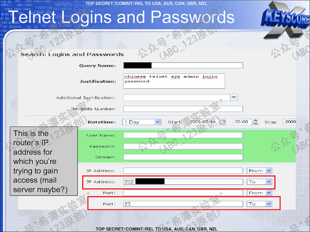 借助XKeyscore关键得分系统,美国NSA情报人员可以输入路由器设备的IP地址和登录端口,如telnet的23端口进行查询。