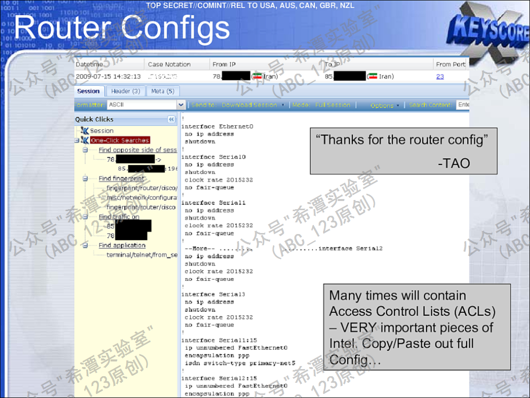 下面这张PPT展示了美国NSA情报人员通过XKeyscore系统,查看指定IP路由设备的配置文件内容。