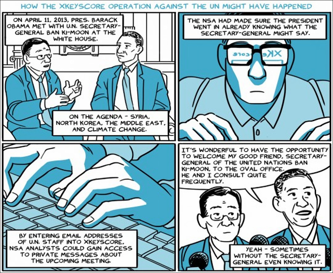 美国国家安全局(NSA)通过XKeyscore系统大规模监听欧洲政客的移动通信,包括电子邮件内容、电话语音、手机短信和社交媒体活动等信息。仅在2009年,就有122名外国领导人遭到美方的监听。俄罗斯、伊朗等被美国视为长期对手的国家,其领导人也成为NSA的监听目标。此外,一些国际组织的高级领导人,如联合国秘书长,亦被纳入监控范围。不仅如此,美国的重要合作伙伴新西兰政府也曾利用XKeyscore监视世界贸易组织总干事职位的候选人,并对所罗门群岛进行过大规模的间谍活动。据国外媒体报道,美国情报专家在XKeyscore的帮助下,在联合国秘书长潘基文与奥巴马总统正式会晤之前,成功获取到了会谈内容的要点。