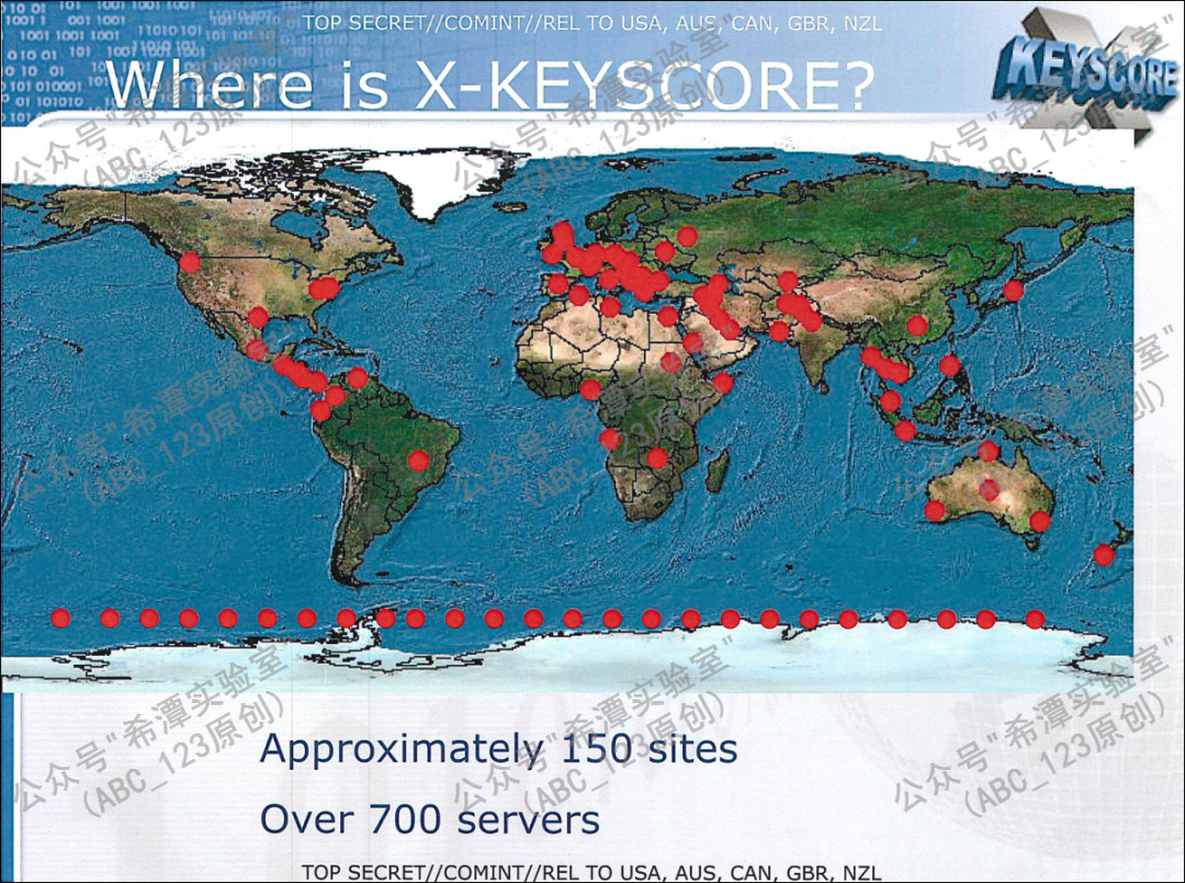 如下图展示了XKeyscore系统在2008年时的全球分布图,在全球五大洲的多个国家建立了150个站点,这些国家包括美国、英国、日本、俄罗斯、墨西哥、巴西、西班牙、索马里、巴基斯坦、澳大利亚、尼日利亚等等,当年服务器规模已超过700台,共同组成一个分布式的信息处理和查询系统,通过大规模分布式计算机集群,极大增强了其数据存储和处理能力。
