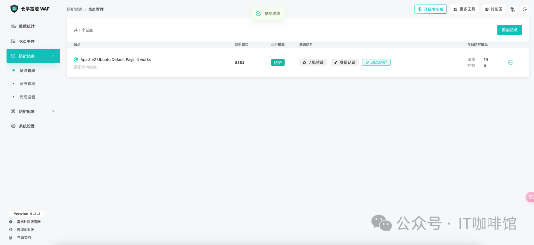 首先我们要配置一下要保护的站点,这里也说明一下,正常使用的时候,不建议把雷池和实际的业务应用部署到一台服务器上,这样对于服务器的负载会很大,存在隐患,最好是单独的一台服务器来部署雷池,之后将流量转给真实应用。