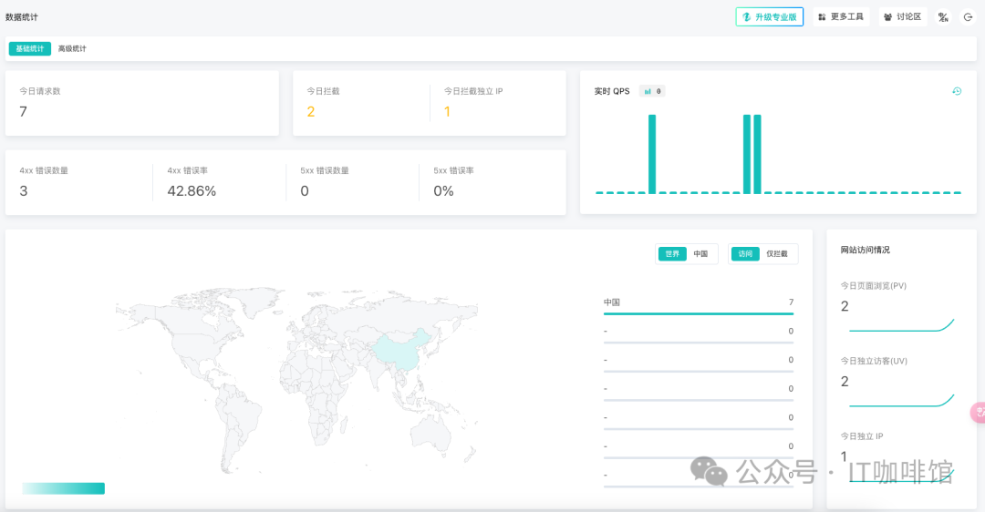 配置完成后,用浏览器访问域名,能获取到业务网站的响应,并且数据统计页的 “今日请求数” 增加,代表配置成功。