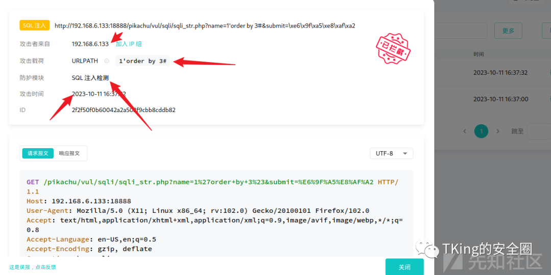 可以点开详情查看,你输入的命令以及你的ip、时间都会被记录,并且属于什么注入也会检测出来