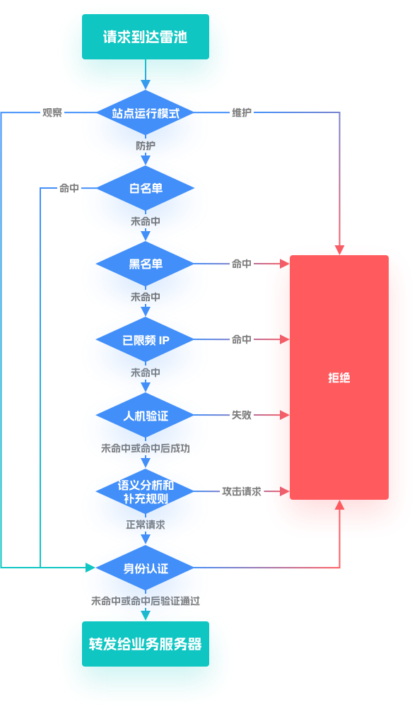 雷池以反向代理方式接入,优先于网站服务器接收流量,对流量中的攻击行为进行检测和清洗,将清洗过后的流量转发给网站服务器。