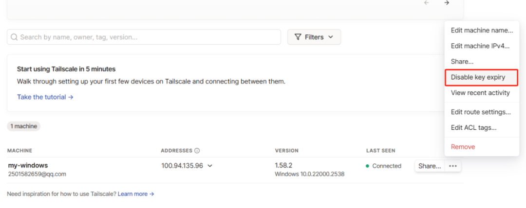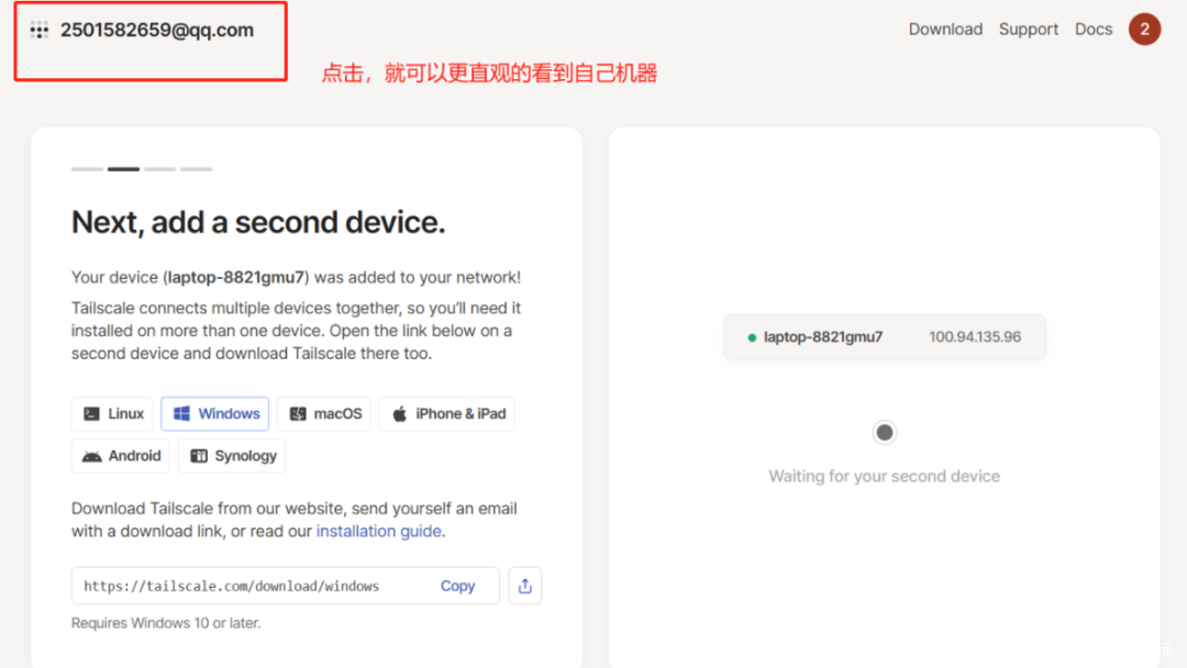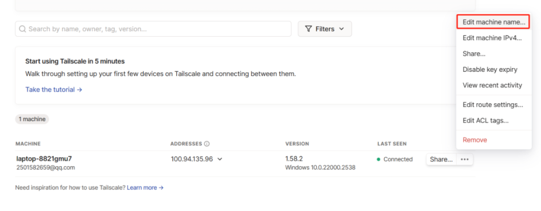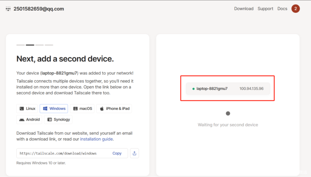 b)此时我的电脑就已经介入 Tailscale 了,分配的 ip 地址就是 100.94.135.96