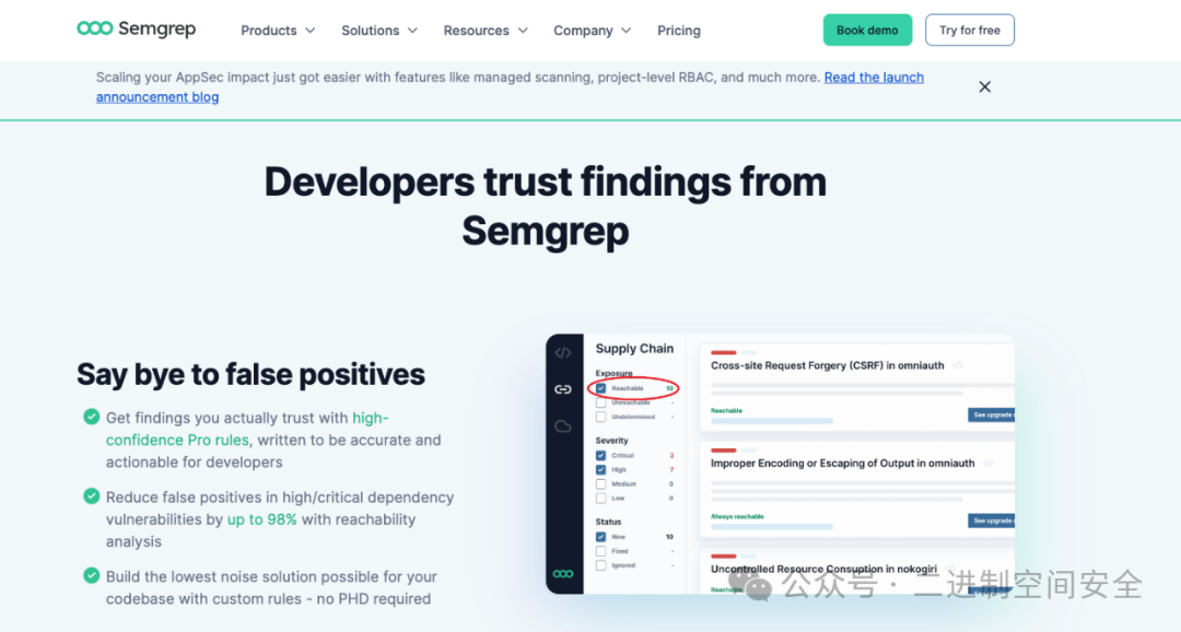 可扩展 - Semgrep 可在需要的任何地方运行,从 CLI 到 CI/CD。调查结果可以显示在开发人员工作流程、Semgrep AppSec 平台中,或者通过 API 显示在现有工具中。