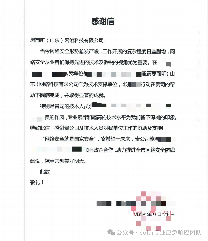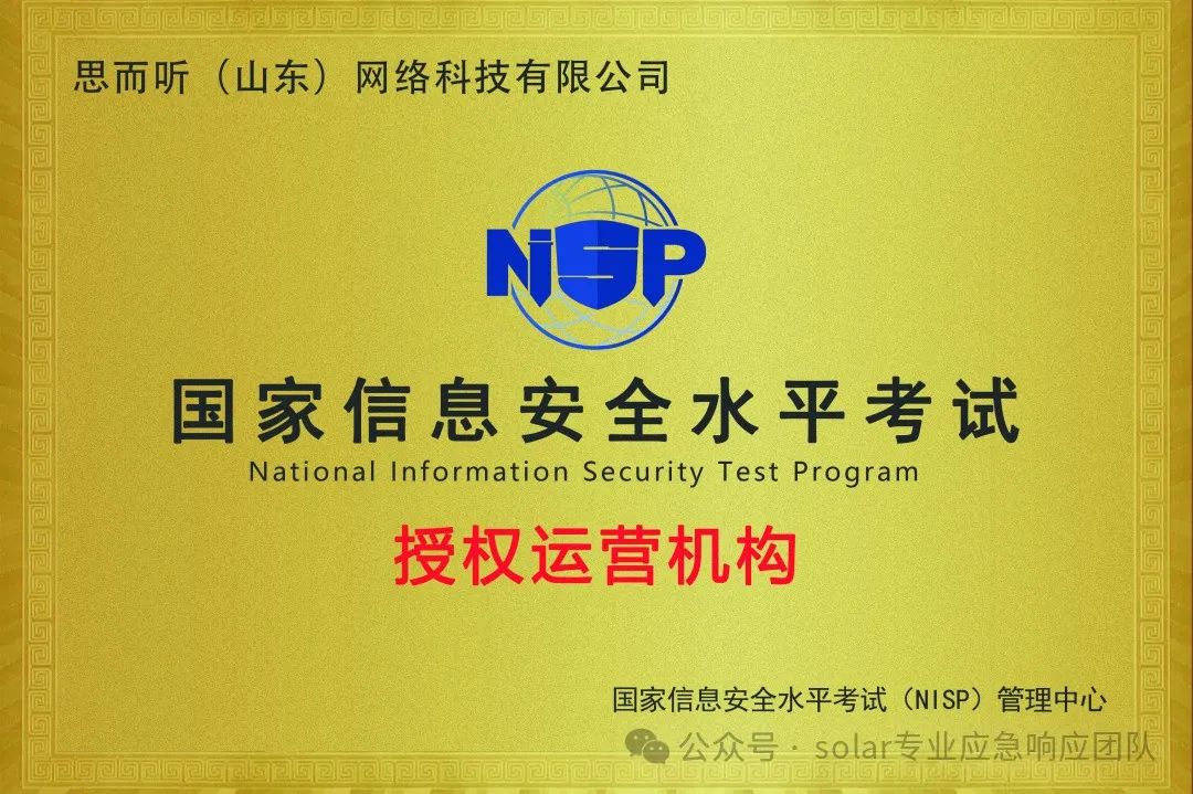 solar团队数年深耕勒索解密与数据恢复领域,在勒索解密和数据恢复领域建立了良好的声誉,以高效、安全、可靠的解决方案赢得了客户的信任。无论是个人用户还是大型企业,都能提供量身定制的服务,确保每一个被勒索软件侵害的数据都能够恢复到最佳状态,同时在解密数据恢复后,提供全面的后门排查及安全加固服务,杜绝二次感染的风险。同时,solar团队坚持自主研发及创新,在攻防演练平台、网络安全竞赛平台、网络安全学习平台方面加大研发投入,目前已获得十几项专利及知识产权。团队也先后通过了ISO9001质量管理体系、ISO14000环境管理体系、ISO45001职业安全健康管理体系 、ITSS(信息技术服务运行维护标准四级)以及国家信息安全漏洞库(CNNVD)技术支撑单位等认证,已构建了网络安全行业合格的资质体系。